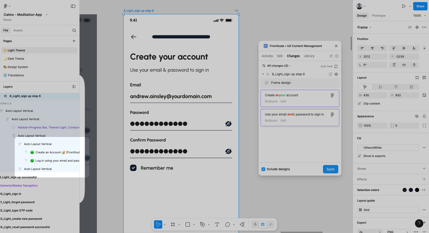 - Sync to apply updates to Figma. Once selected, click Sync and Frontitude will update the relevant text layers inside the Figma file.